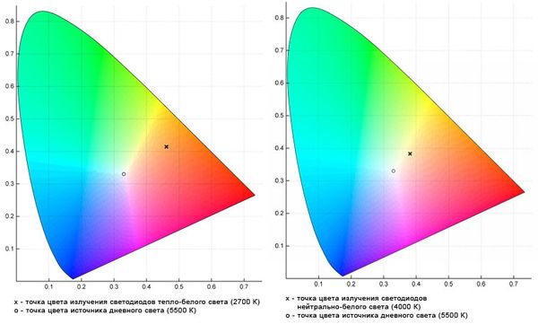 Положение СДЛ теплого и нейтрально-белого света на цветовой диаграмме. В конкретных образцах отклонения могут быть значительны