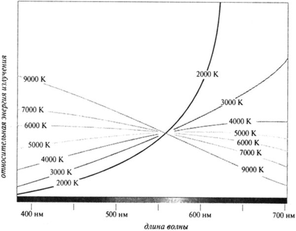 Спектральные кривые абсолютно черного тела. Температура 3000-4000 К дает оранжево-желтые тона, при 5000-7000 К свет относительно ровный во всем спектре (нейтрально-белый тон), при 9000 К и выше преобладают короткие волны (голубоватые тона)