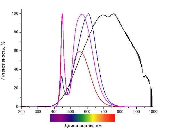 Спектр трех разных СДЛ и одной ЛН (черная линия). Пики излучения смещаются, что свидетельствует о разном составе люминофора